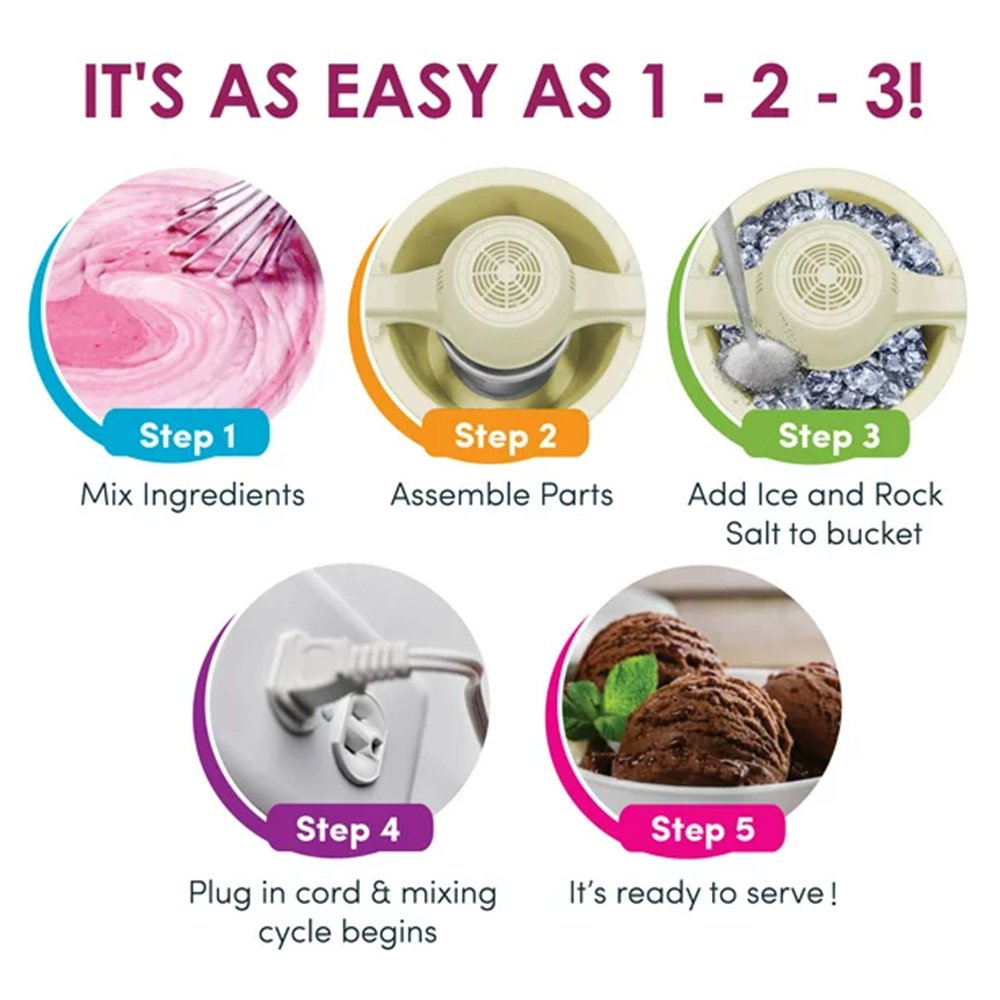 2.It’s great for entertaining at family parties, BBQ’s and picnics using all of your favorite ice cream, sorbet, gelato and even frozen yogurt recipes. The motor turns a six-fin paddle that whips air into the ingredients producing a smooth, rich soft serve ice cream.