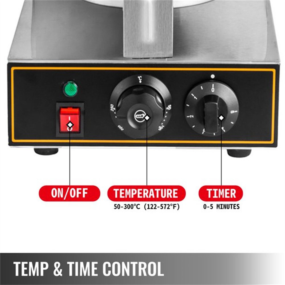 Our electric egg roll maker is composed of a stainless steel body and cast-aluminum heating plates with non-stick Teflon coating. It is durable; sturdy; and easy to clean; serving you for a relatively long time. It is equipped with an internal temperature protector; which is reliable and secure to operate. Temperature is 50-300℃ (122-572℉) adjustable; and the countdown timer can be set within 5 minutes. With the advantages of clean; sanitation; smooth operation; and energy-saving; our professional waffle machine is ideal for both commercial and household use.