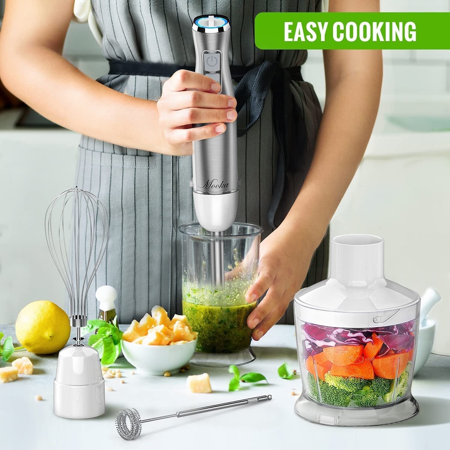 3.5-in-1 Multi-Purpose: Versatile handheld stick blender, 600ml mixing beaker, 500ml food chopper, egg whisk and milk frother meet your various needs for mixing, chopping, egg-beating, puree and preparing baby food. The 360° safety lock and one-click installation make removal and cleaning so easy