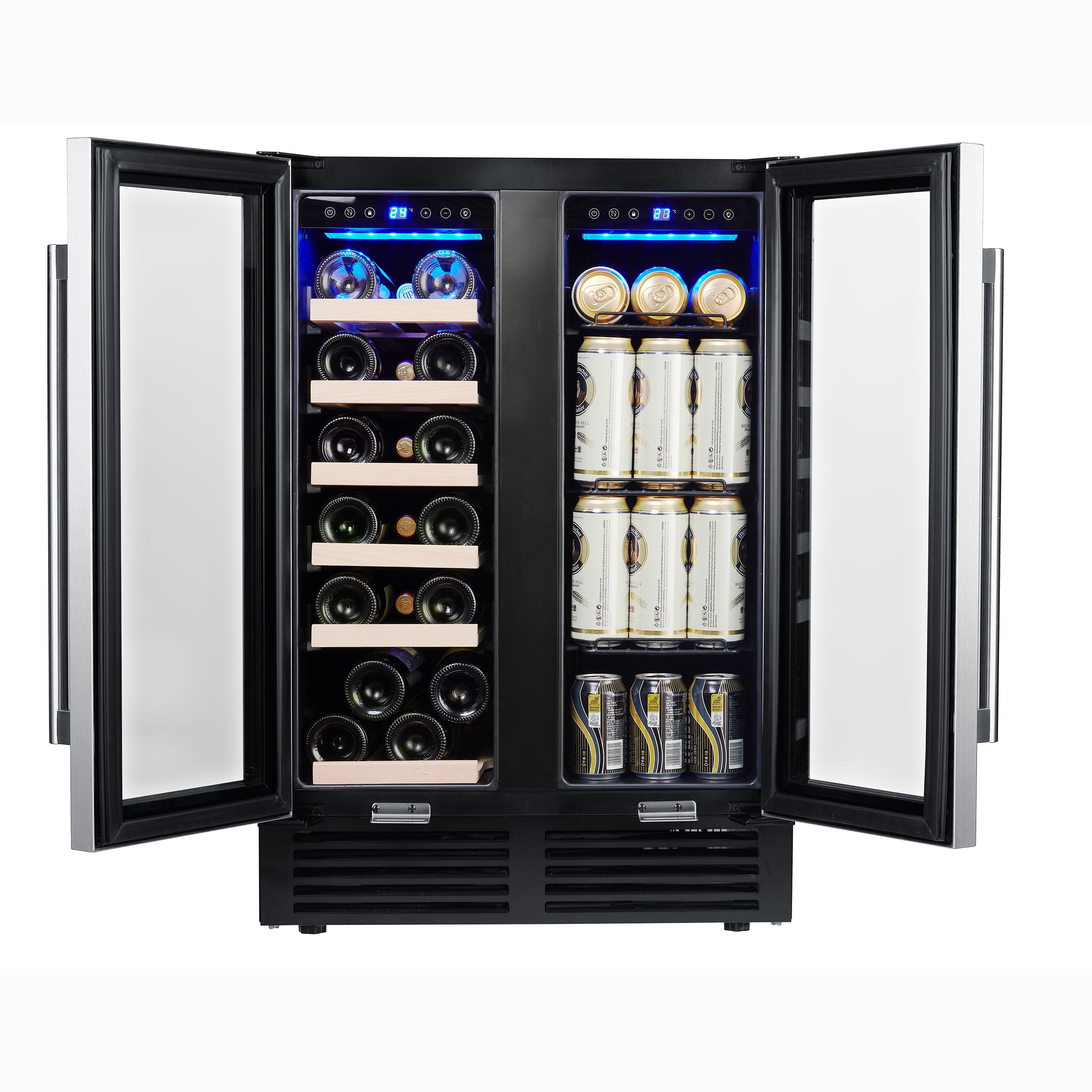 4.Quiet and Quick Cooling:Utilizing the cooler runs quietly(40dB) and cool quickly, Cold air is distributed via high-efficiency compressor and circulation fans, the whole cooler can be maintained ideal climate settings. Ensure that every bottles or cans keep the same humidity. Each cooling zone is illuminated by blue LED lights