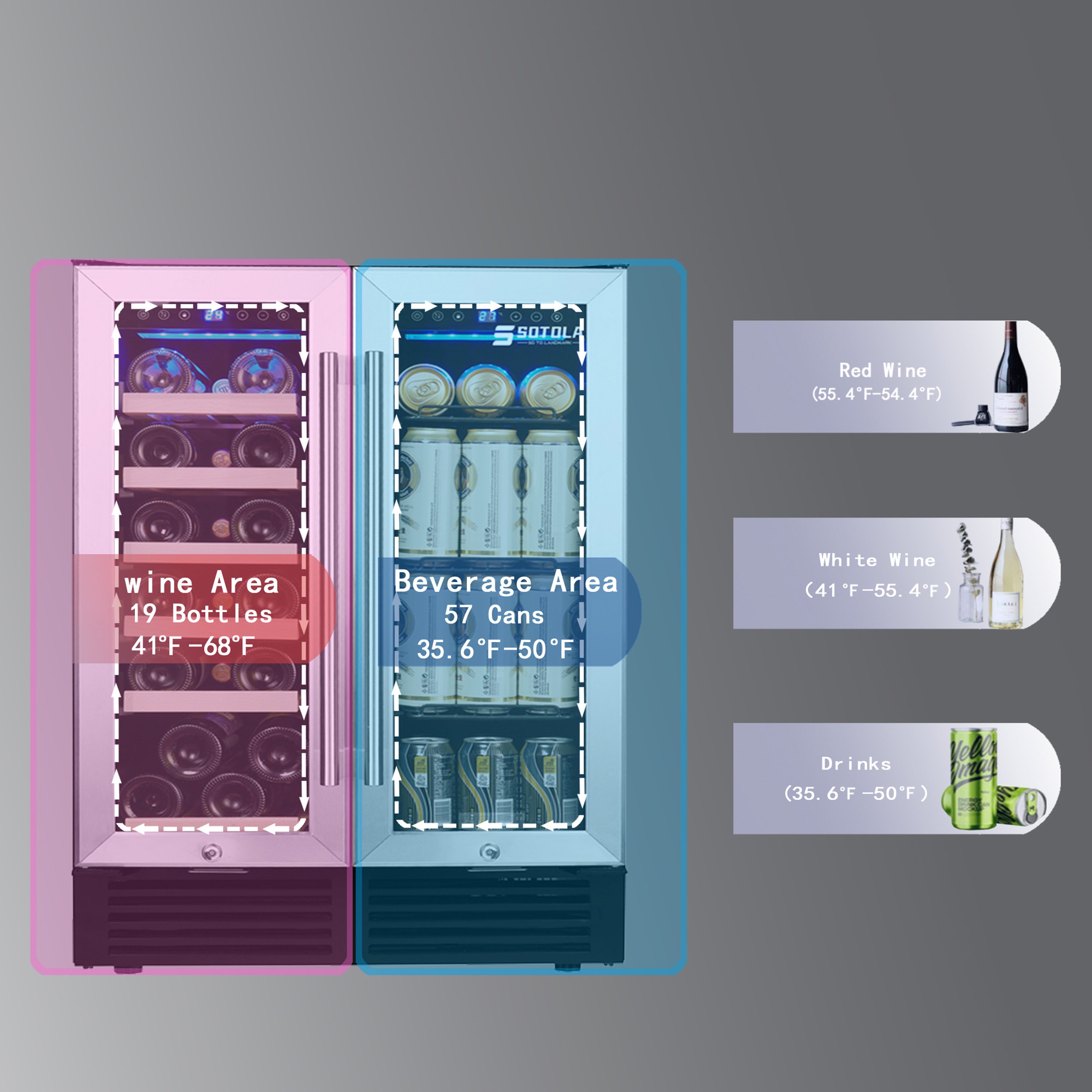 2.Dual zone: LED control display makes it easy to set temperature from 41-68°F, providing perfect chilling temperature all the time! The Left zone ranges from 41°F to 68° while the Right zone from 36°F to 50°F. You would not only just enjoy your wine but also enjoy your drink at the same time.